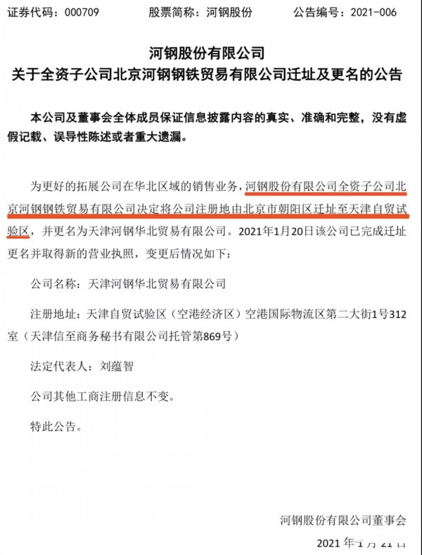 另外,為更好的拓展公司在華北區(qū)域的銷(xiāo)售業(yè)務(wù),河鋼股份有限公司全資子公司北京河鋼鋼鐵貿(mào)易有限公司決定將公司注冊(cè)地由北京市朝陽(yáng)區(qū)遷址至天津自貿(mào)試驗(yàn)區(qū),并更名為天津河鋼華北貿(mào)易有限公司。2021年1月20日該公司已完成遷址 更名并取得新的營(yíng)業(yè)執(zhí)照。