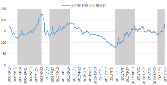 與前三輪周期上漲的最高點(diǎn)相比,本輪鋼價(jià)指數(shù)最高點(diǎn)已高于第三輪,即2017年12月的高點(diǎn),但未超過(guò)前兩輪。