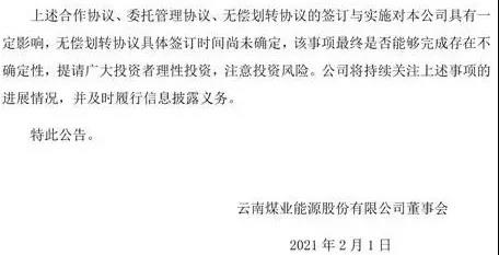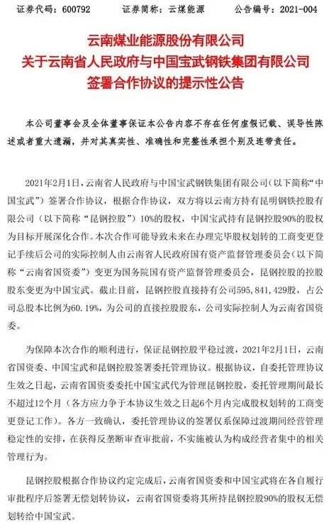 核心提示:2月1日午間,云南煤業(yè)能源股份有限公司(下稱云煤能源,600792)公告披露,當(dāng)天,云南省人民政府與鋼鐵央企中國寶武鋼鐵集團有限