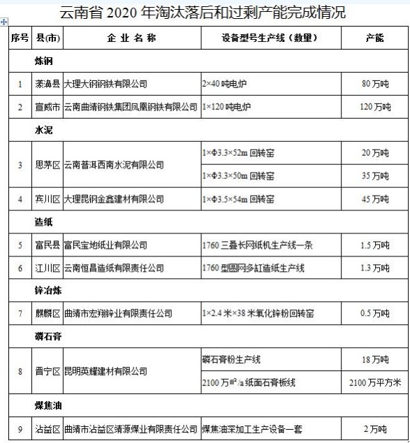 附件:云南省2020年淘汰落后和過剩產(chǎn)能完成情況
