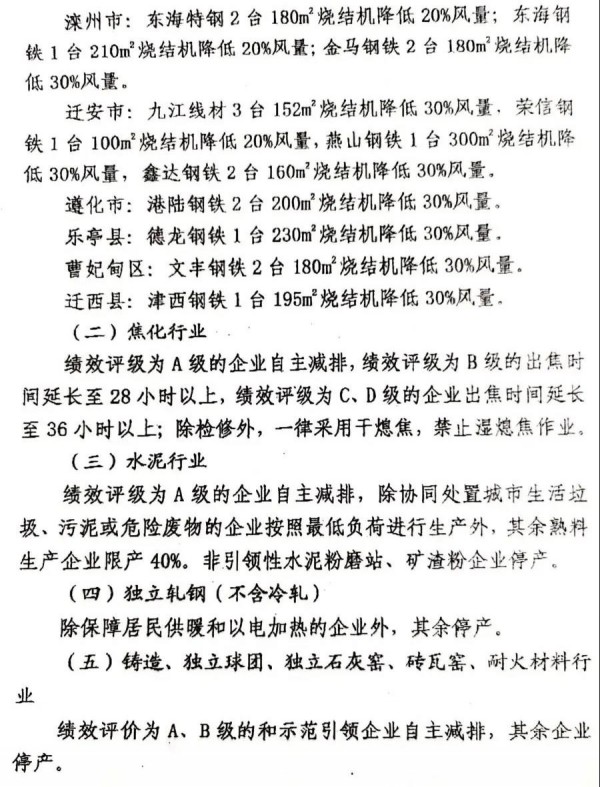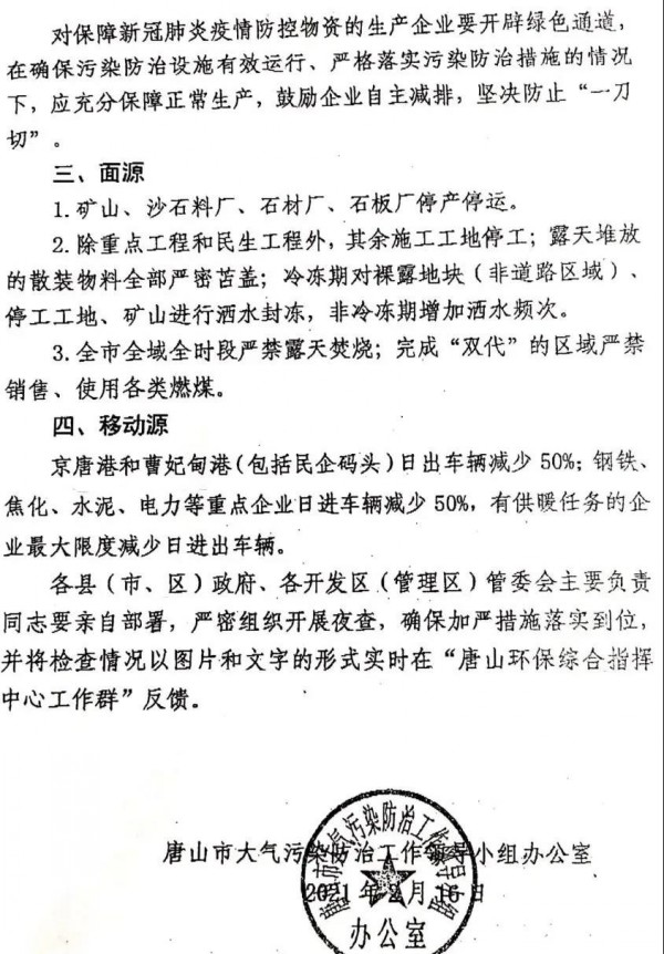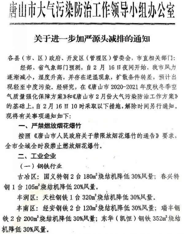 2月16日,唐山市大氣污染防治工作領(lǐng)導(dǎo)小組辦公室發(fā)布《關(guān)于進(jìn)一步加嚴(yán)源頭減排的通知》。自2月16日10時(shí)開始,執(zhí)行對燒結(jié)機(jī)進(jìn)行全面限產(chǎn)、對焦化行業(yè)部分企業(yè)延長出焦時(shí)間等減排措施。