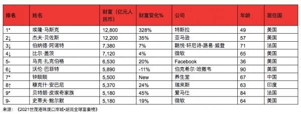 2021年3月2日,胡潤(rùn)研究院發(fā)布《2021胡潤(rùn)全球富豪榜》,特斯拉的埃隆·馬斯克首次成為世界首富,財(cái)富總額達(dá)1.28萬億元人民幣。亞洲首富、中國(guó)首富則是“瓶裝水之王”、67歲的鐘睒睒。