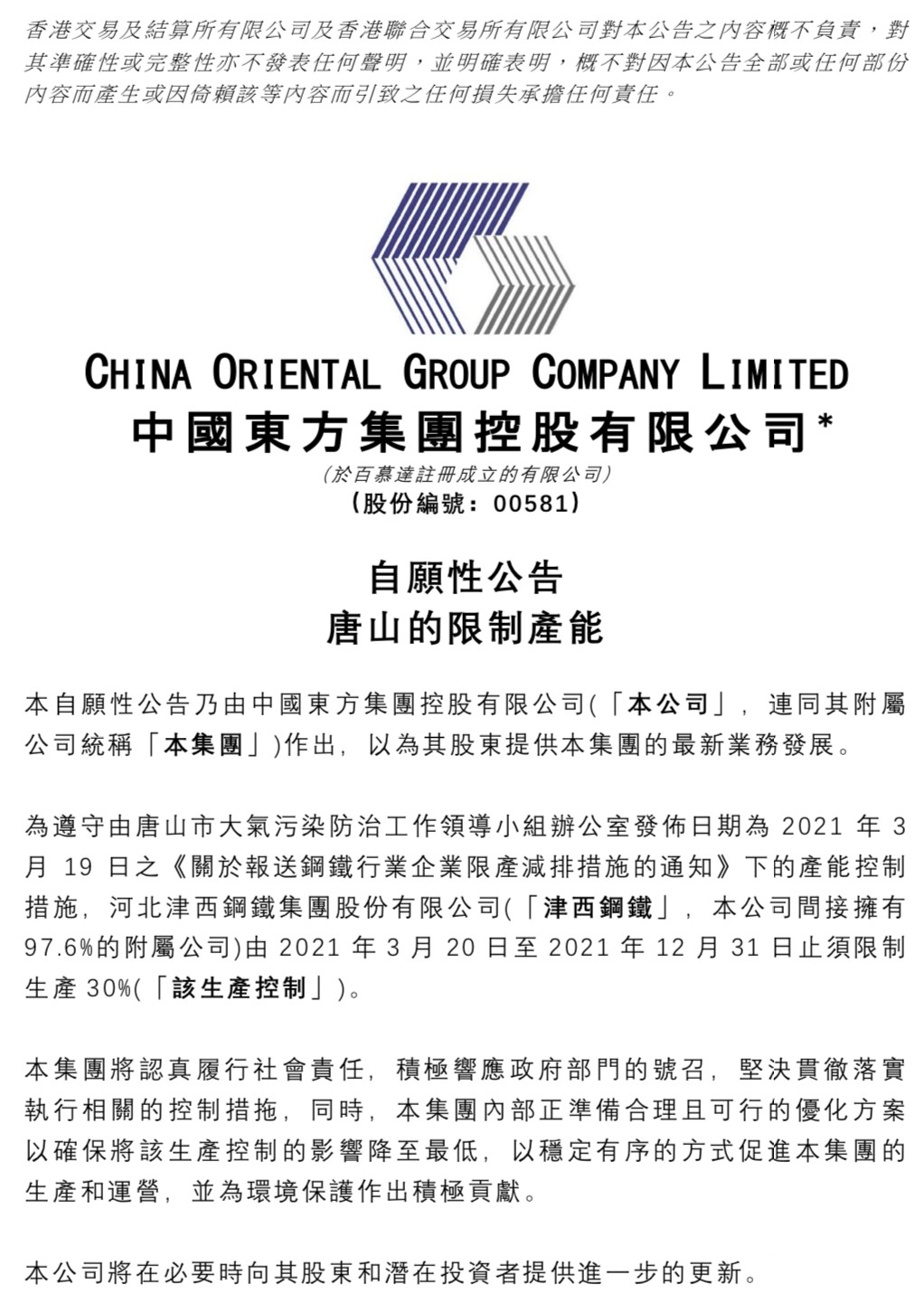 中國東方集團(tuán)(以下簡稱集團(tuán))發(fā)布公告,為遵守由唐山市大氣污染防治工作領(lǐng)導(dǎo)小組辦公室發(fā)布日期為2021年3月19日的《關(guān)于報(bào)送鋼鐵行業(yè)企業(yè)限產(chǎn)減排措施的通知》下的產(chǎn)能控制措施,河北津西鋼鐵集團(tuán)股份有限公司(津西鋼鐵,公司間接擁有97.6%的附屬公司)由2021年3月20日至2021年12月31日止須限制生產(chǎn)30%。