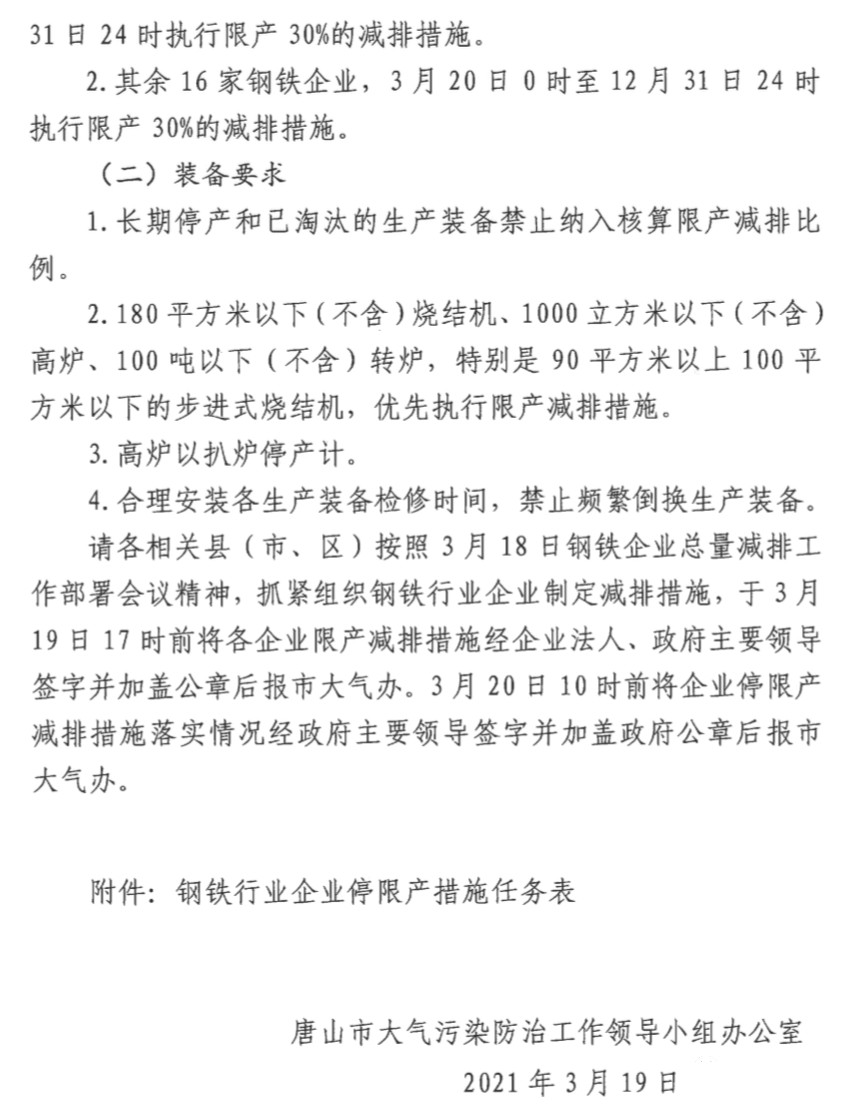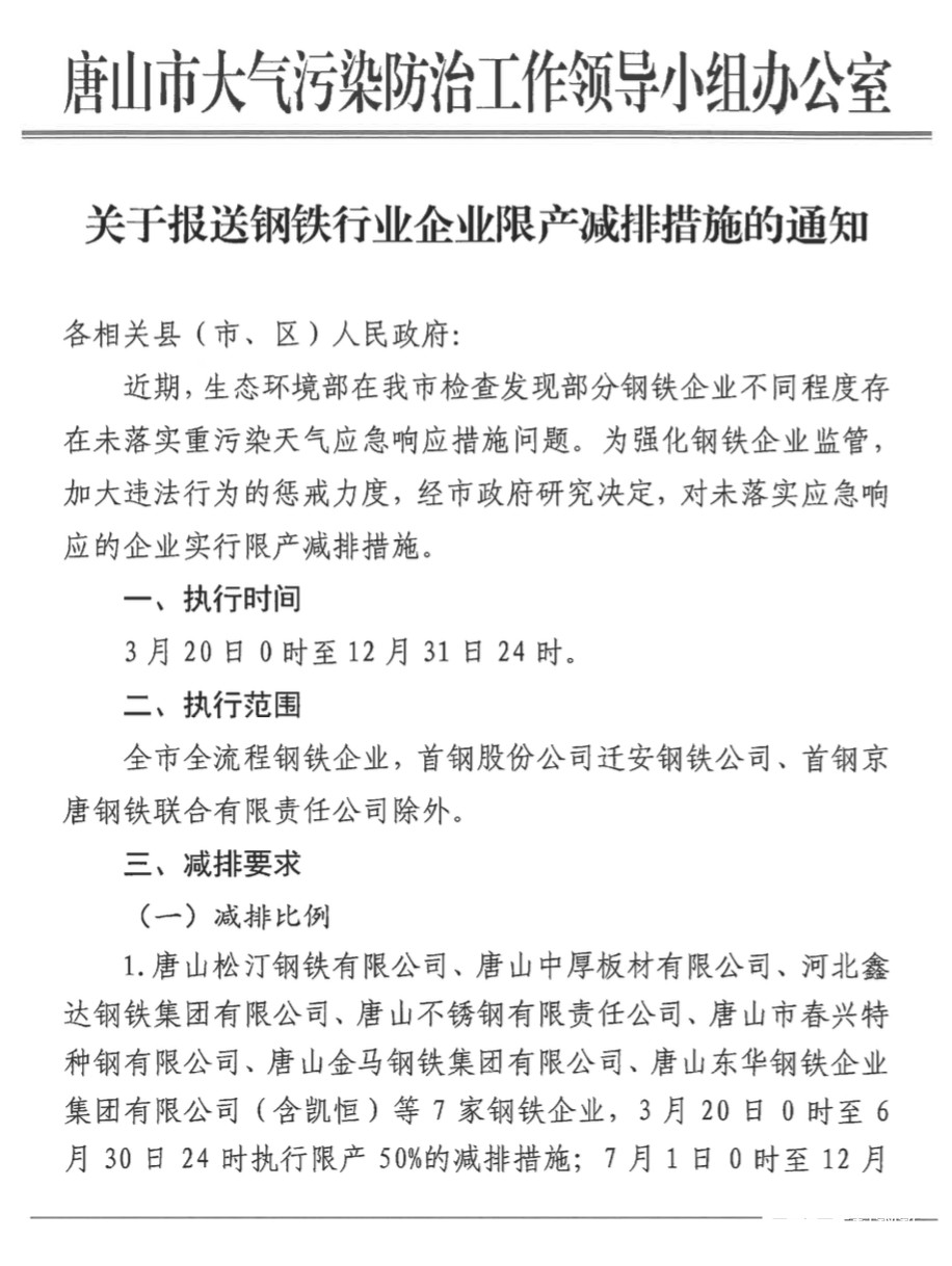 1、唐山松汀鋼鐵有限公司、河北鑫達(dá)鋼鐵集團(tuán)有限公司,3月20日0時(shí)至6月30日24時(shí)執(zhí)行限產(chǎn)50%的減排措施;7月1日0時(shí)至12月31日24時(shí)執(zhí)行限產(chǎn)30%的減排措施。