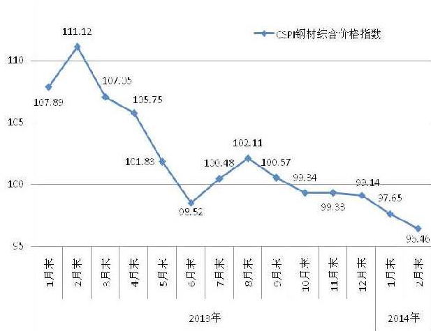 鋼材價(jià)格繼續(xù)回落,同比大幅下降。2月末,鋼協(xié)CSPI鋼材綜合價(jià)格指數(shù)為96.46點(diǎn)(見右圖),環(huán)比下降1.19點(diǎn),降幅為1.22%,較1月份收窄0.28個(gè)百分點(diǎn),連續(xù)第6個(gè)月下跌;同比下降14.66點(diǎn),降幅為13.19%。