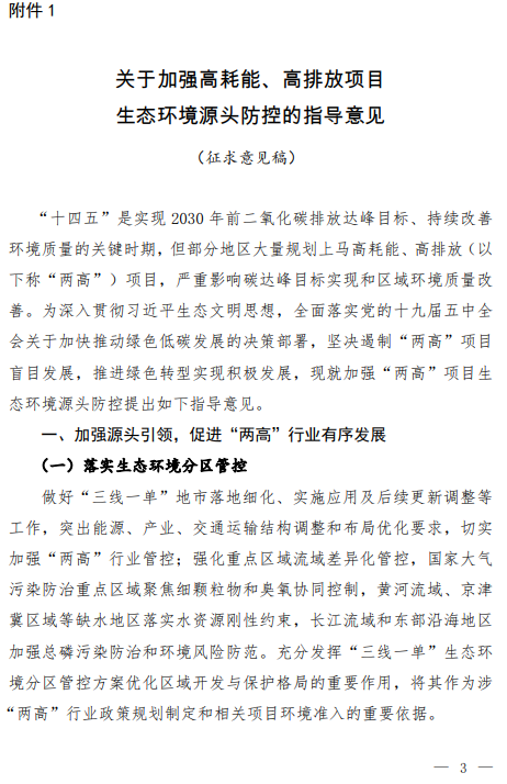 近日,生態(tài)環(huán)境部發(fā)布了關(guān)于征求《關(guān)于加強(qiáng)高耗能、高排放項(xiàng)目生態(tài)環(huán)境源頭防控的指導(dǎo)意見(征求意見稿)》意見的函,稱為全面落實(shí)黨的十九屆五中全會(huì)關(guān)于加快推動(dòng)綠色低碳發(fā)展的決策部署,堅(jiān)決遏制高耗能、高排放(以下簡(jiǎn)稱“兩高”)項(xiàng)目盲目發(fā)展,加強(qiáng)“兩高”項(xiàng)目生態(tài)環(huán)境源頭預(yù)防,推動(dòng)行業(yè)綠色轉(zhuǎn)型,生態(tài)環(huán)境部組織起草了《關(guān)于加強(qiáng)高耗能、高排放項(xiàng)目生態(tài)環(huán)境源頭防控的指導(dǎo)意見(征求意見稿)》。請(qǐng)研究提出意見,于2021年4月21日前反饋。