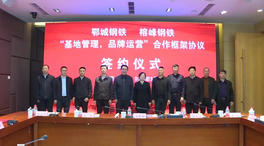 2021年3月25日,鄂城鋼鐵與十堰榕峰鋼鐵和十堰市政府相關領導齊聚十堰,簽訂“基地管理+品牌運營”合作框架協(xié)議。