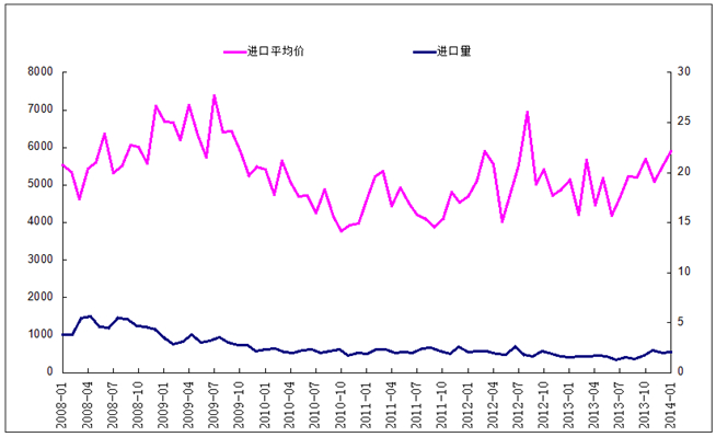 圖9:2008年到2014年2月我國無縫管進(jìn)口量與其進(jìn)口平均單價(jià)的曲線圖(單位:萬噸)