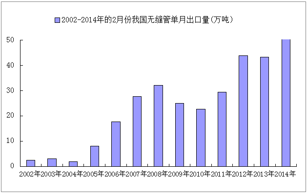 圖5:2002年到2014年2月無縫管出口量柱形圖(單位:萬噸)