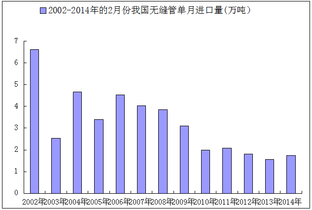 圖8:2004年到2014年2月無縫管進(jìn)口量柱形圖(單位:萬噸)