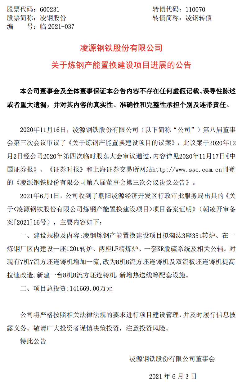 2021年6月1日,公司收到了朝陽凌源經(jīng)濟(jì)開發(fā)區(qū)行政審批服務(wù)局出具的《關(guān)于〈凌源鋼鐵股份有限公司煉鋼產(chǎn)能置換建設(shè)項目〉項目備案證明》(朝凌開審備案[2021]16號),主要內(nèi)容如下: