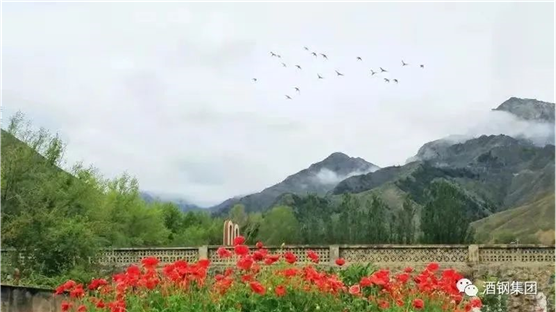 站在雨后的酒鋼廠區(qū),遠處是清晰可見的皚皚雪山,眼前是澄凈無云的蔚藍天空,成片的鮮花隨風(fēng)搖曳,白鷺在湖面恬靜棲息,不遠處高聳的煙囪沒有一絲青煙,巨大的冷卻塔成為了“酒鋼藍”的背景。
