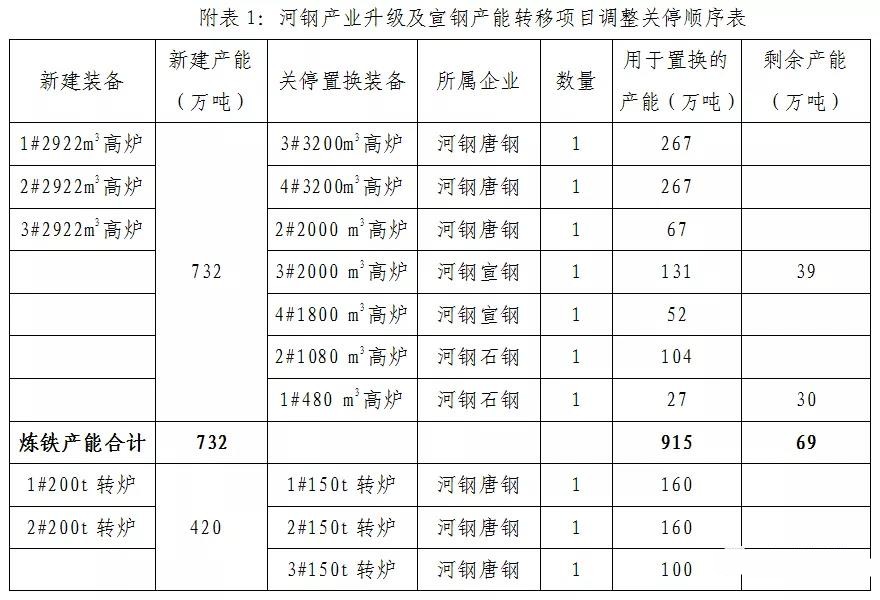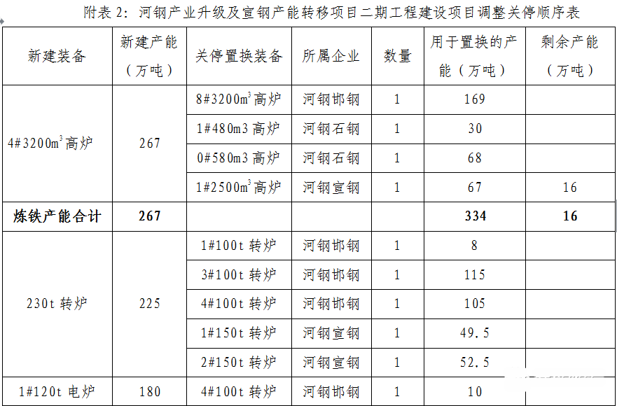按照產(chǎn)能置換政策的相關(guān)要求,河鋼產(chǎn)業(yè)升級(jí)及宣鋼產(chǎn)能轉(zhuǎn)移項(xiàng)目、河鋼集團(tuán)石家莊鋼鐵有限責(zé)任公司建設(shè)項(xiàng)目、河鋼產(chǎn)業(yè)升級(jí)及宣鋼產(chǎn)能轉(zhuǎn)移項(xiàng)目二期工程建設(shè)項(xiàng)目、河鋼邯鋼老區(qū)退城整合項(xiàng)目產(chǎn)能置換方案分別于2017年2月27日、2018年11月27日、2019年1月22日、2019年10月11日面向社會(huì)公告,4個(gè)項(xiàng)目產(chǎn)能置換方案均屬河鋼集團(tuán)內(nèi)部產(chǎn)能置換。國(guó)家暫停鋼鐵產(chǎn)能置換政策期間,部分項(xiàng)目已具備投產(chǎn)條件,相對(duì)應(yīng)的部分置換裝備無(wú)法按時(shí)退出,為實(shí)現(xiàn)項(xiàng)目順利投產(chǎn),河鋼集團(tuán)在不改變產(chǎn)能置換比例的前提下,對(duì)4個(gè)項(xiàng)目的退出裝備關(guān)停順序進(jìn)行了調(diào)整,現(xiàn)予以補(bǔ)充公告。