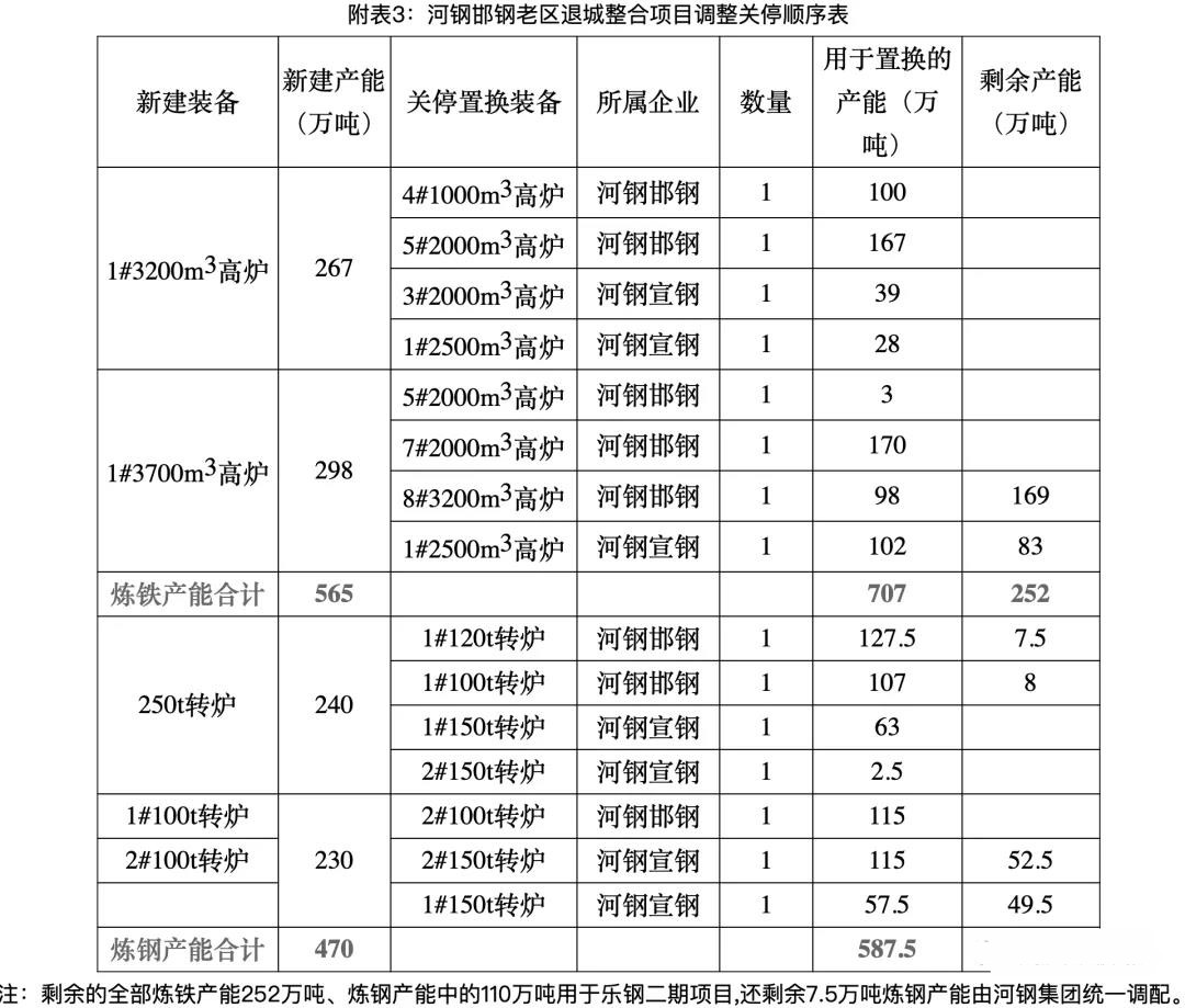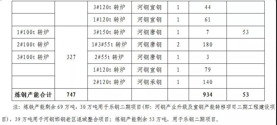 注:轉(zhuǎn)爐改電爐等量置換,剩余退出配套高爐鐵產(chǎn)能229萬(wàn)噸分別用于樂鋼一期(即:河鋼產(chǎn)業(yè)升級(jí)及宣鋼產(chǎn)能轉(zhuǎn)移項(xiàng)目)、二期項(xiàng)目。