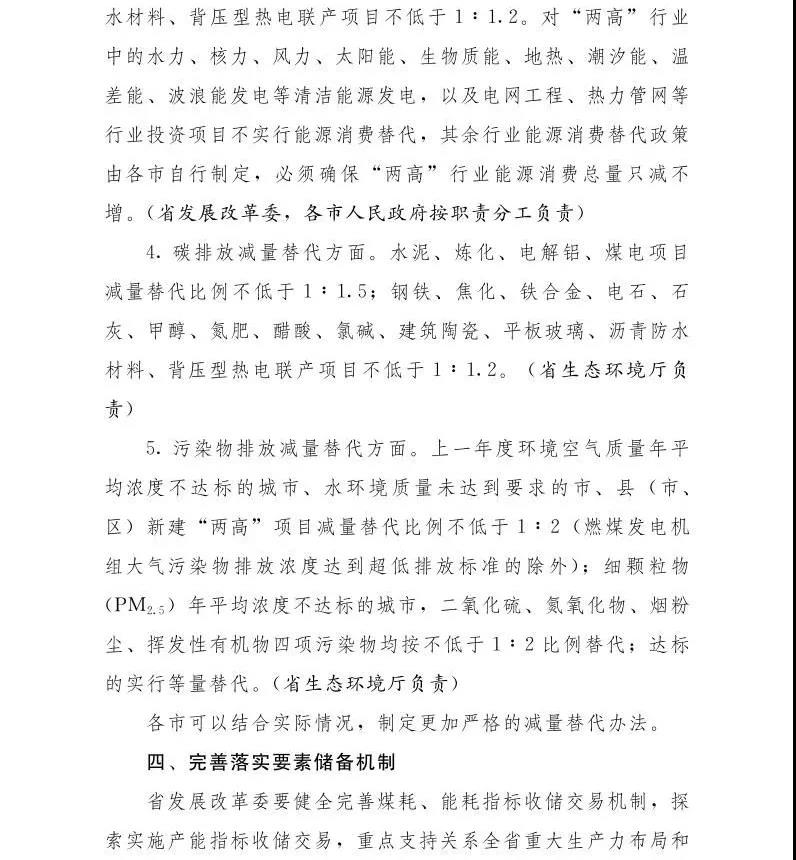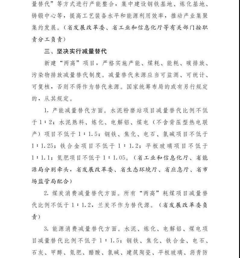 新建“兩高"項(xiàng)目,嚴(yán)格實(shí)施產(chǎn)能、煤耗、能耗、碳排放、 污染物排放減量替代制度。減量替代來(lái)源應(yīng)當(dāng)可監(jiān)測(cè)、可統(tǒng)計(jì)、 可復(fù)核,否則不得作為替代來(lái)源,國(guó)家統(tǒng)籌布局的或有另行規(guī)定的,從其規(guī)定。產(chǎn)能減量替代方面,水泥粉磨站項(xiàng)目減量替代比例不低 于1:2;水泥熟料、煉化、電解鋁、煤電(不含背壓型熱電聯(lián)產(chǎn))項(xiàng)目不低于1 :1.5;鋼鐵、焦化、電石、氯堿項(xiàng)目不低于 1 :1.25;鐵合金項(xiàng)目不低于1 :1.2;平板玻璃項(xiàng)目不低于1:1.1;氮肥項(xiàng)目不低于1 :1.05。各市可以結(jié)合實(shí)際情況,制定更加嚴(yán)格的減量替代辦法。