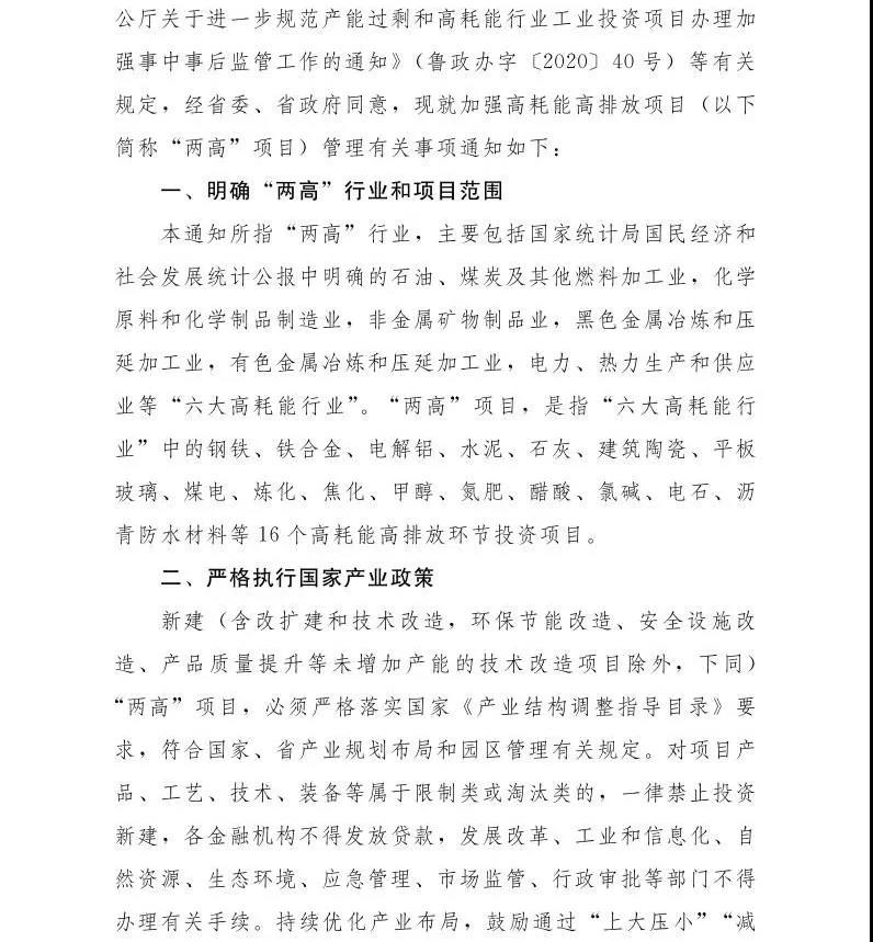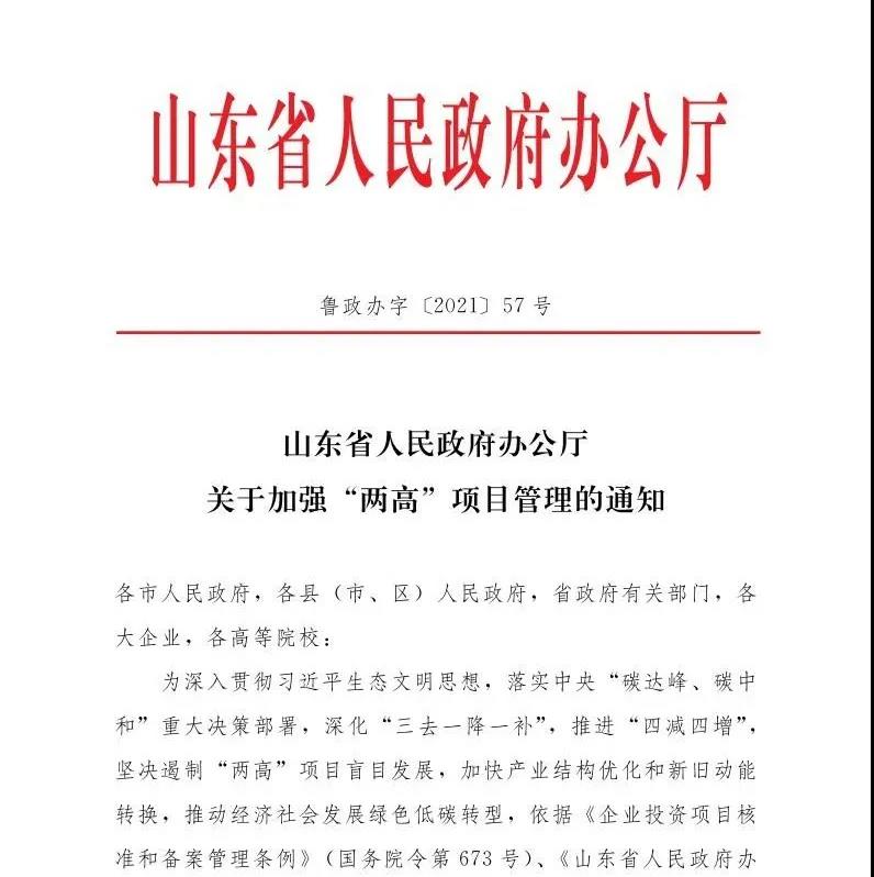 為深入貫徹習(xí)近平生態(tài)文明思想,落實(shí)中央“碳達(dá)峰、碳中和”重大決策部署,深化“三去一降一補(bǔ)”,推進(jìn)“四減四增”, 堅(jiān)決遏制“兩高”項(xiàng)目盲目發(fā)展,加快產(chǎn)業(yè)結(jié)構(gòu)優(yōu)化和新舊動(dòng)能轉(zhuǎn)換,推動(dòng)經(jīng)濟(jì)社會(huì)發(fā)展綠色低碳轉(zhuǎn)型,依據(jù)《企業(yè)投資項(xiàng)目核準(zhǔn)和備案管理?xiàng)l例》(國(guó)務(wù)院令第673號(hào))、《山東省人民政府辦公廳關(guān)于進(jìn)一步規(guī)范產(chǎn)能過(guò)剩和高耗能行業(yè)工業(yè)投資項(xiàng)目辦理加強(qiáng)事中事后監(jiān)管工作的通知》(魯政辦字〔2020〕40號(hào))等有關(guān)規(guī)定,經(jīng)省委、省政府同意。山東省人民政府辦公廳印發(fā)《關(guān)于加強(qiáng)“兩高”項(xiàng)目管理的通知》,現(xiàn)就將有關(guān)事項(xiàng)通知如下: