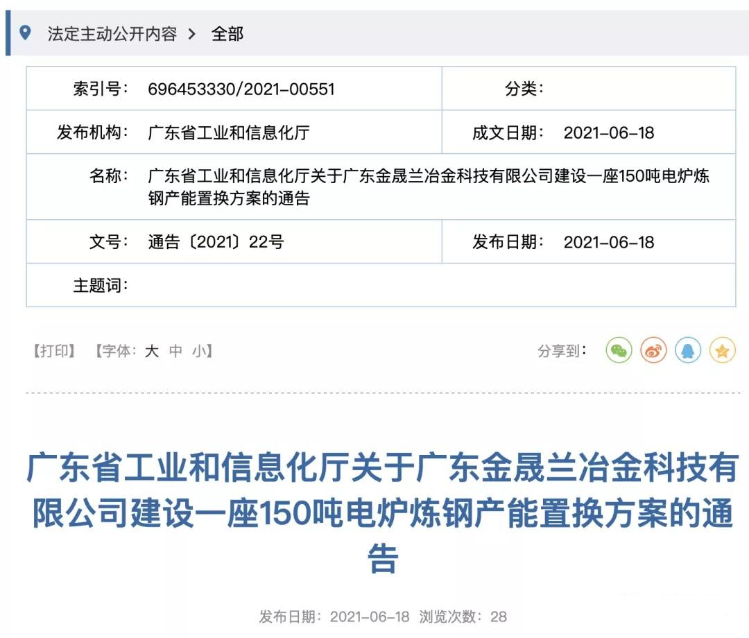 按照《國務院關于化解產(chǎn)能嚴重過剩矛盾的指導意見》(國發(fā)〔2013〕41號)、《國務院關于鋼鐵行業(yè)化解過剩產(chǎn)能實現(xiàn)脫困發(fā)展的意見》(國發(fā)〔2016〕6號)、《工業(yè)和信息化部關于印發(fā)鋼鐵行業(yè)產(chǎn)能置換實施辦法的通知》(工信部原〔2021〕46號)和《工業(yè)和信息化部關于印發(fā)鋼鐵水泥玻璃行業(yè)產(chǎn)能置換實施辦法的通知》(工信部原〔2017〕337號)要求,經(jīng)企業(yè)申請、云浮市工業(yè)和信息化主管部門初審、我廳審核并進行網(wǎng)上公示無異議,現(xiàn)將廣東金晟蘭冶金科技有限公司建設一座150噸電爐煉鋼產(chǎn)能置換方案予以通告,歡迎社會公眾進行監(jiān)督。