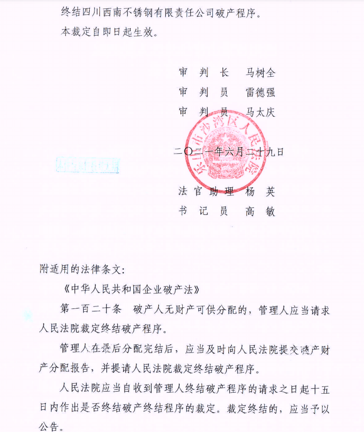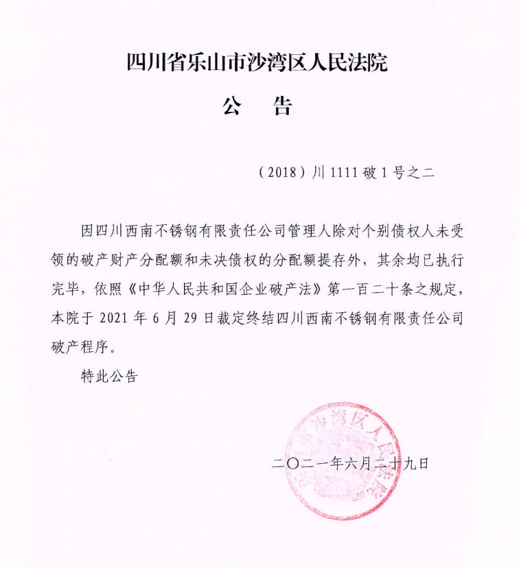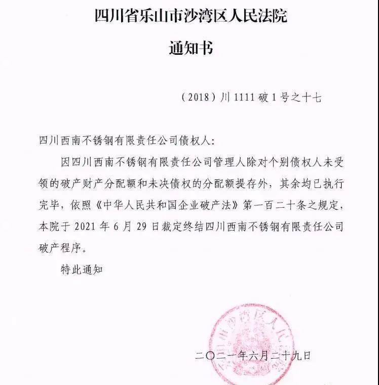 6月29日,四川省樂山市沙灣區(qū)人民法院裁定終結(jié)四川西南不銹鋼有限責(zé)任公司破產(chǎn)程序。