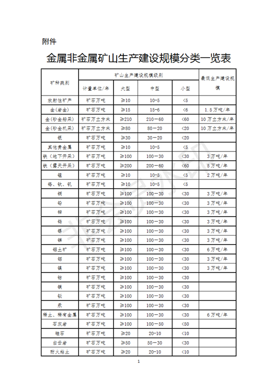 礦山規(guī)模等級(jí)劃分按照《關(guān)于調(diào)整部分礦種礦山生產(chǎn)建設(shè)規(guī)模標(biāo)準(zhǔn)的通知》中的分類表執(zhí)行(見(jiàn)附件)。