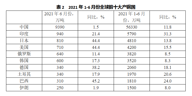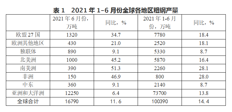 2021年1-6月份,全球粗鋼產(chǎn)量為10.039億噸,同比增長(zhǎng)14.4%。其中,亞洲和大洋洲合計(jì)粗鋼產(chǎn)量為7.37億噸,同比增長(zhǎng)13.8%;歐盟生產(chǎn)粗鋼7780萬(wàn)噸,同比增長(zhǎng)18.4%;北美洲粗鋼產(chǎn)量為5870萬(wàn)噸,同比增長(zhǎng)16.4%;南美洲粗鋼產(chǎn)量為2260萬(wàn)噸,同比增長(zhǎng)28.1%;獨(dú)聯(lián)體地區(qū)粗鋼產(chǎn)量為5330萬(wàn)噸,同比增長(zhǎng)8.7%;非洲粗鋼產(chǎn)量為800萬(wàn)噸,同比增長(zhǎng)28.0%。