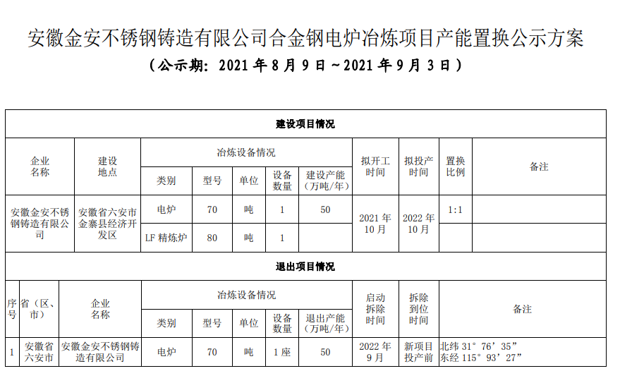 安徽金安不銹鋼鑄造有限公司合金鋼電爐冶煉項(xiàng)目產(chǎn)能置換方案公示