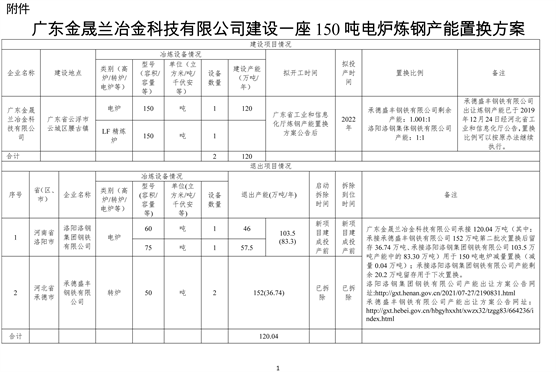 關(guān)于廣東金晟蘭冶金科技有限公司建設(shè)一座150噸電爐煉鋼產(chǎn)能置換方案的公示