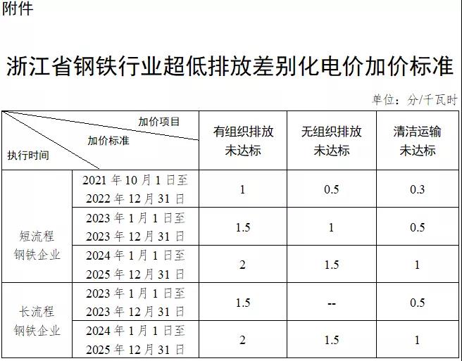 浙江省將根據(jù)有資質(zhì)的監(jiān)測機(jī)構(gòu)和有能力的技術(shù)機(jī)構(gòu)出具的鋼鐵企業(yè)超低排放評估監(jiān)測報告,對全省未按國家及省鋼鐵行業(yè)超低排放改造要求完成“有組織排放、無組織排放、清潔方式運(yùn)輸”全流程超低排放改造和評估監(jiān)測的鋼鐵企業(yè),以及改造后未達(dá)到超低排放要求的鋼鐵企業(yè),其全部購電量(含市場化交易電量)實(shí)行分類別分階段分項目加價政策(具體見附件)。鋼鐵企業(yè)已執(zhí)行其他差別化電價、懲罰性電價或階梯電價政策的,按照最高加價標(biāo)準(zhǔn)執(zhí)行,不重復(fù)加價。