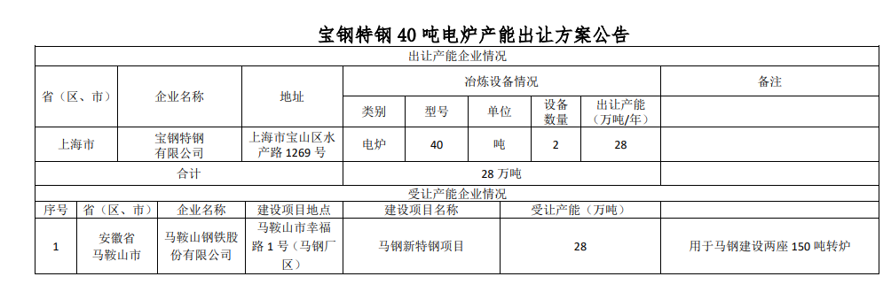 按照《國(guó)務(wù)院關(guān)于化解產(chǎn)能嚴(yán)重過(guò)剩矛盾的指導(dǎo)意見(jiàn)》、《國(guó)務(wù)院關(guān)于鋼鐵行業(yè)化解過(guò)剩產(chǎn)能實(shí)現(xiàn)脫困發(fā)展的意見(jiàn)》和《鋼鐵行業(yè)產(chǎn)能置換實(shí)施辦法》要求,經(jīng)國(guó)務(wù)院國(guó)資委(國(guó)資廳改革〔2021〕240號(hào))復(fù)函同意,擬將寶鋼特鋼2座40噸電爐產(chǎn)能出讓?,F(xiàn)將寶鋼特鋼2座40噸電爐對(duì)應(yīng)28萬(wàn)噸煉鋼產(chǎn)能出讓方案予以公告,歡迎社會(huì)公眾進(jìn)行監(jiān)督。