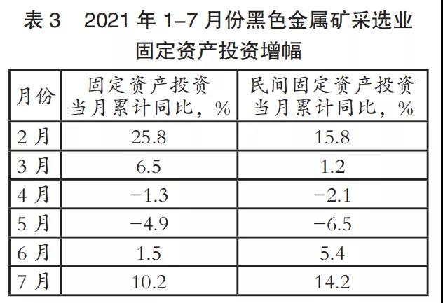 國家統(tǒng)計局?jǐn)?shù)據(jù)顯示,2021年1-7月份,我國黑色金屬礦采選業(yè)固定資產(chǎn)投資額累計增長10.2%,其中,黑色金屬礦采選業(yè)民間固定資產(chǎn)投資累計增長14.2%,均實現(xiàn)了兩位數(shù)增幅,見表3。從資本的逐利性角度來看,前七個月黑色金屬礦采選業(yè)民間固定資產(chǎn)投資的大幅增長在很大程度上反映出企業(yè)和投資機構(gòu)對鐵礦行業(yè)前景的積極預(yù)期。