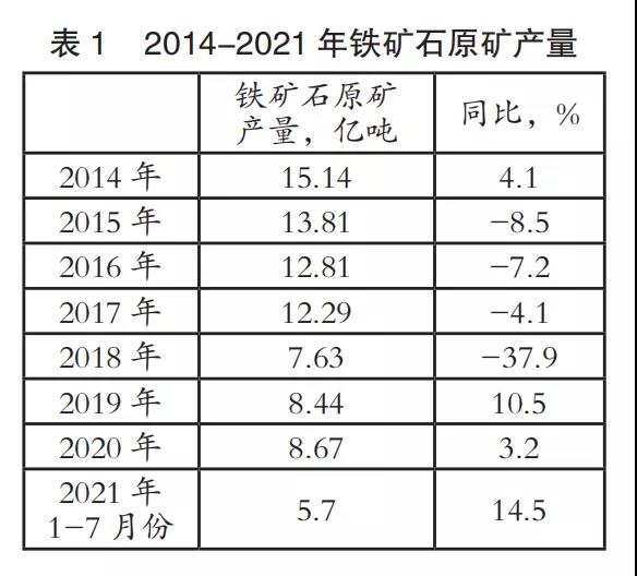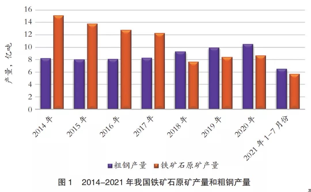 自2015年以來,受國家政策影響,我國鐵礦石原礦產(chǎn)量持續(xù)下降,到2018年降至近年來低點7.63億噸,僅為2014年產(chǎn)量15.14億噸的一半左右,2019和2020年產(chǎn)量連續(xù)回升,但仍低于10億噸,見表1。近年來,國內(nèi)礦山發(fā)展受安全、環(huán)境、生態(tài)、資源等因素約束,不同程度存在“一刀切”的情況,加上新建礦山項目審批難度大、程序多、周期長等問題,鐵礦企業(yè)采礦權(quán)獲取成本高,生產(chǎn)運營稅負(fù)重,大大制約了新建礦山項目進(jìn)度。相比之下,我國粗鋼產(chǎn)量卻從2015年的8.04億噸逐年增長,到2020年達(dá)到10.65億噸,創(chuàng)歷史新高,見圖1。