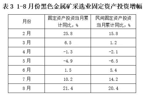 國(guó)家統(tǒng)計(jì)局?jǐn)?shù)據(jù)顯示,2021年1-8月份,我國(guó)黑色金屬礦采選業(yè)固定資產(chǎn)投資額累計(jì)增長(zhǎng)21.4%,其中,黑色金屬礦采選業(yè)民間固定資產(chǎn)投資累計(jì)增長(zhǎng)20.4%,均實(shí)現(xiàn)了兩位數(shù)增幅(見(jiàn)表3)。從資本的逐利性角度來(lái)看,前七個(gè)月黑色金屬礦采選業(yè)民間固定資產(chǎn)投資的大幅增長(zhǎng)在很大程度上反映出企業(yè)和投資機(jī)構(gòu)對(duì)鐵礦行業(yè)前景的積極預(yù)期。
