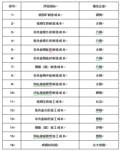 此次評(píng)選包括10項(xiàng)主要產(chǎn)品制造成本、5項(xiàng)加工成本和噸鋼材利潤(rùn)共16個(gè)指標(biāo)。其中,太鋼、八鋼分別占據(jù)4項(xiàng)指標(biāo),太鋼在煉鋼生鐵制造成本、非合金鋼板坯制造成本、非合金鋼中板制造成本、熱軋薄寬鋼帶制造成本4項(xiàng)指標(biāo)上為最佳企業(yè),八鋼在非合金鋼方坯制造成本、低合金鋼方坯制造成本、非合金鋼線材制造成本、鋼筋(Ⅲ)制造成本4項(xiàng)指標(biāo)上為最佳企業(yè);普陽(yáng)鋼鐵為占據(jù)2項(xiàng)指標(biāo)(非合金板坯加工成本、熱軋薄寬鋼帶加工成本)的最佳企業(yè);其余6家企業(yè)分別占據(jù)1項(xiàng)指標(biāo),酒鋼為燒結(jié)礦制造成本指標(biāo)最佳企業(yè),柳鋼為冷軋薄寬鋼帶制造成本指標(biāo)最佳企業(yè),首鋼長(zhǎng)鋼為煉鋼生鐵加工成本最佳企業(yè),沙鋼為鋼筋(Ⅲ)加工成本最佳企業(yè),萍鋼為低合金方坯加工成本指標(biāo)最佳企業(yè),方大特鋼為噸鋼材利潤(rùn)指標(biāo)最佳企業(yè)。