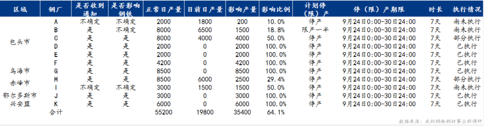 截至目前,內(nèi)蒙古區(qū)域內(nèi)11家樣本鋼廠已經(jīng)有6家全部停產(chǎn),占樣本企業(yè)54.5%,2家鋼廠部分停產(chǎn),還有3家鋼廠處于不確定狀態(tài)。目前區(qū)域內(nèi)樣本鋼廠日均產(chǎn)量19800噸,影響日均產(chǎn)量35400噸,限產(chǎn)比例已經(jīng)到正常產(chǎn)量的64.1%,涉及建筑鋼材軋線已經(jīng)停產(chǎn)18條,占樣本總數(shù)85.7%。
