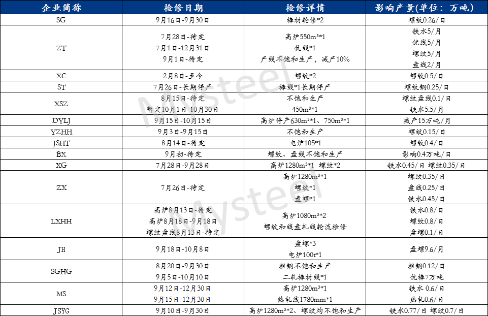 據(jù)Mysteel不完全統(tǒng)計(jì),9月全國(guó)多個(gè)省份發(fā)布鋼鐵企業(yè)停產(chǎn)檢修情況,涉及鋼廠超80家,具體情況如下: