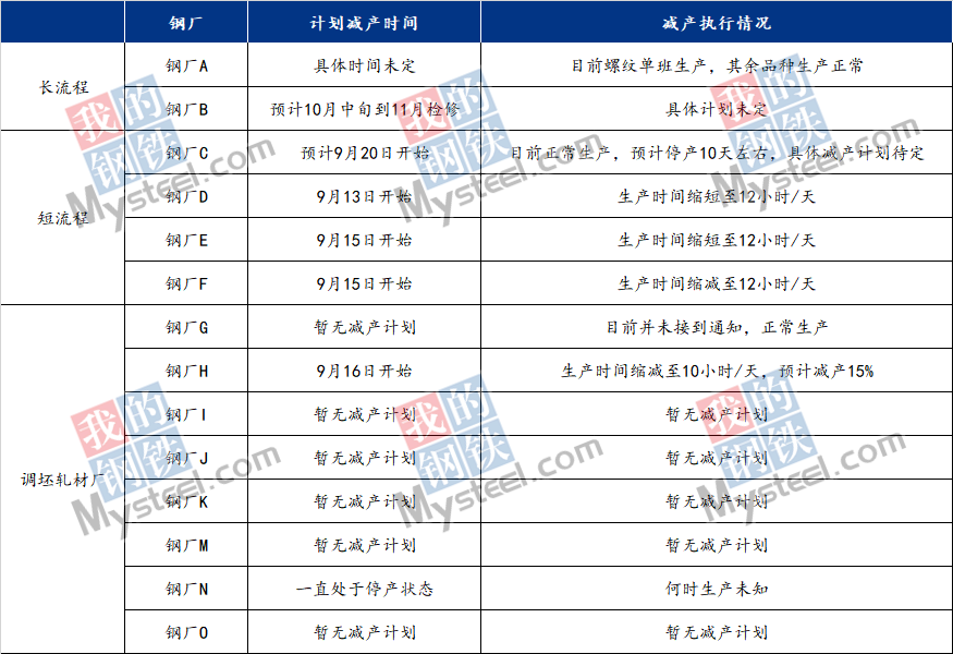 根據(jù)Mysteel調(diào)研,受能耗“雙控”影響,近期浙江省多數(shù)鋼廠都收到了減產(chǎn)的通知,并計(jì)劃逐步落實(shí)減產(chǎn)。目前短流程鋼廠減產(chǎn)計(jì)劃主要集中在9月13日—9月30日,長(zhǎng)流程鋼廠具體減產(chǎn)檢修計(jì)劃未定,部分調(diào)坯軋材廠生產(chǎn)時(shí)間也受到一定限制。