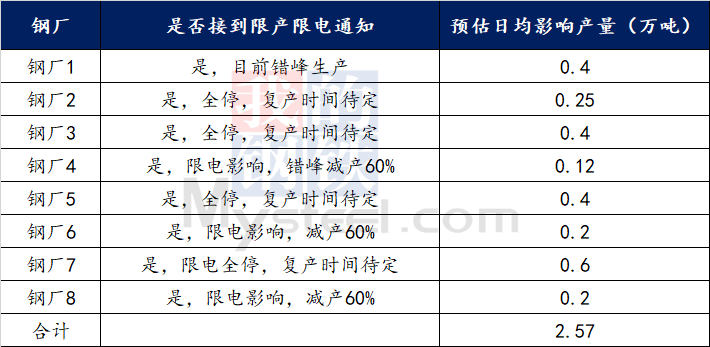 9月23日國(guó)網(wǎng)沈陽供電公司發(fā)布《關(guān)于9月23日遼寧省實(shí)施拉閘限電的通知》后,據(jù)Mysteel調(diào)研顯示,遼寧省內(nèi)14家鋼鐵生產(chǎn)企業(yè)中有8家表示已經(jīng)接到限電通知并在協(xié)調(diào)減產(chǎn)以減少用電量、減產(chǎn)品種以建筑鋼材為主,有3家表示已接到限電通知但對(duì)鋼鐵生產(chǎn)影響不大,另有3家表示目前尚未收到限電以及減產(chǎn)通知,詳細(xì)影響情況我網(wǎng)稍后發(fā)布。
