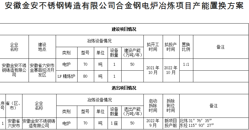 關(guān)于安徽金安不銹鋼鑄造有限公司合金鋼電爐冶煉項(xiàng)目產(chǎn)能置換方案的公告
