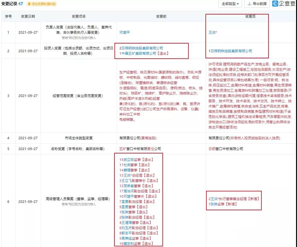 企查查信息顯示,日照鋼鐵集團(tuán)已全部收購中國五礦集團(tuán)在五礦營(yíng)口中板有限責(zé)任公司的股份,100%控股五礦營(yíng)口中板有限責(zé)任公司,將公司更名為日鋼營(yíng)口中板有限公司,原公司董事長(zhǎng)鄧楚平等17大高管退出,其中王洪、張琳兩位高管職務(wù)變更。