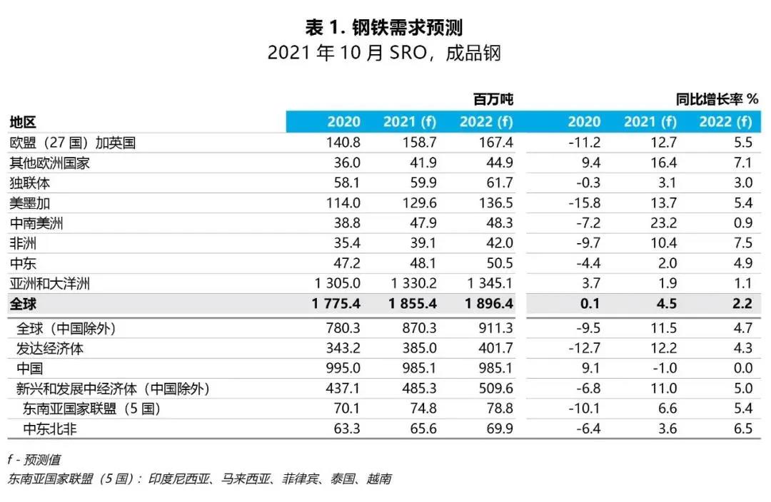 對于發(fā)達(dá)經(jīng)濟體的需求,2022年,隨著供應(yīng)鏈瓶頸的減少、抑制需求的持續(xù)釋放以及企業(yè)和消費者信心的提升,復(fù)蘇態(tài)勢將更加有力。發(fā)達(dá)經(jīng)濟體的鋼鐵需求量繼2020年下降12.7%后,將在2021年增長12.2%,在2022年繼續(xù)增長4.3%,達(dá)到疫情之前的水平。