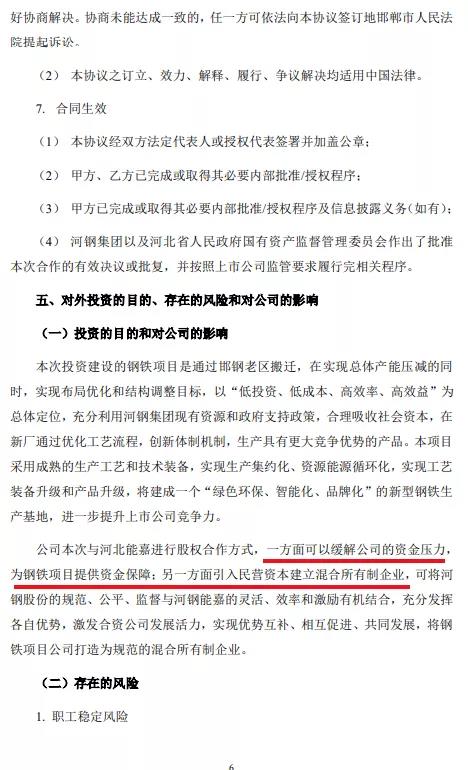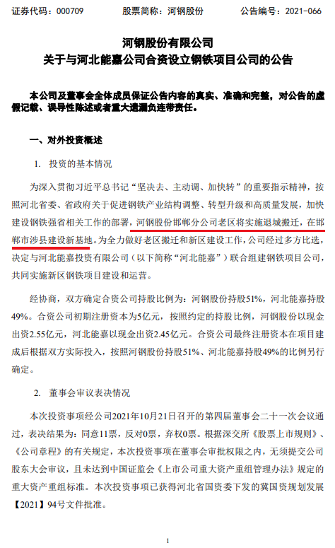 10月22日,河北大型國有鋼企河鋼集團旗下上市公司河鋼股份有限公司發(fā)布報告,河鋼股份邯鄲分公司老區(qū)將實施退城搬遷,在邯鄲市涉縣建設(shè)新基地。公司與河北能嘉(武安市民營企業(yè))聯(lián)合組建鋼鐵項目公司,共同實施新區(qū)鋼鐵項目建設(shè)和運營,河鋼股份持股51%,該合資公司初期注冊資本為5億元。