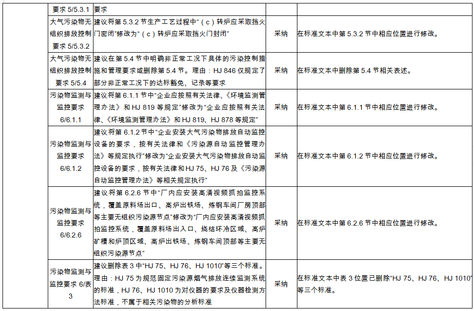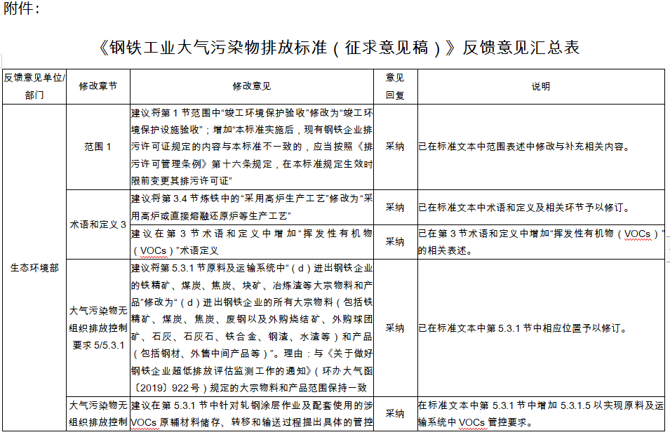 2021年6月4日,《鋼鐵工業(yè)大氣污染物排放標(biāo)準(zhǔn)(征求意見稿)》正式對外征求意見,同時向90個有關(guān)單位發(fā)了征求意見的函,共收到修改反饋意見75條,經(jīng)研究采納意見的58條,部分采納的3條,未采納的14條(具體情況見附件)。