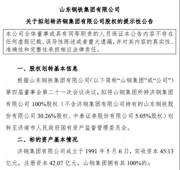 2021年10月18日,山東鋼鐵集團(tuán)公告,根據(jù)公司第四屆董事會(huì)第二十一次會(huì)議決議,擬將公司所持濟(jì)鋼集團(tuán)有限公司100%股權(quán)劃轉(zhuǎn)至濟(jì)南市國資委,其中不含濟(jì)鋼集團(tuán)持有的山東鋼鐵股份有限公司30.26%股權(quán)、中泰證券股份有限公司5.05%股權(quán)。本次股權(quán)劃轉(zhuǎn)已經(jīng)山鋼集團(tuán)董事會(huì)審議通過,股權(quán)劃轉(zhuǎn)事宜及具體實(shí)施方案尚需山鋼集團(tuán)股東會(huì)審議。
