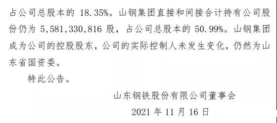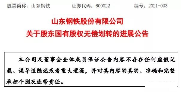 在此之前,2021年10月16日,山東鋼鐵股份有限公司發(fā)布《山東鋼鐵股份有限公司關(guān)于股東國有股權(quán)無償劃轉(zhuǎn)的進(jìn)展公告》。