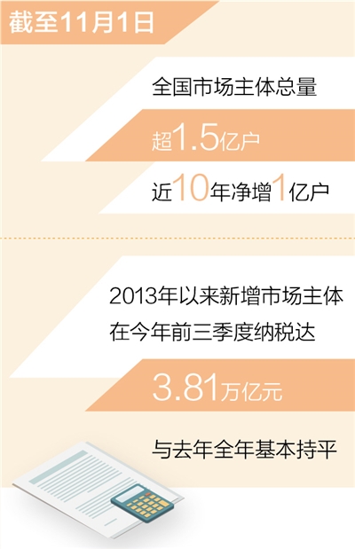最新數(shù)據顯示,截至11月1日,全國市場主體總量超1.5億戶,近10年凈增1億戶。億萬市場主體的磅礴力量推動了我國經濟總量、國家財力和社會財富穩(wěn)定增長,承載了7億多人就業(yè)的基本盤。