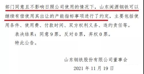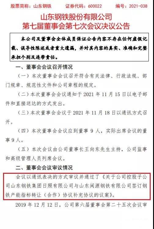 2021年11月19日,山東鋼鐵發(fā)布公告,會議以通訊表決的方式審議并通過了《關(guān)于公司控股子公司山東鋼鐵集團日照有限公司與山東閩源鋼鐵有限公司簽訂鋼鐵產(chǎn)能指標轉(zhuǎn)讓(合作)協(xié)議補充協(xié)議的議案》。