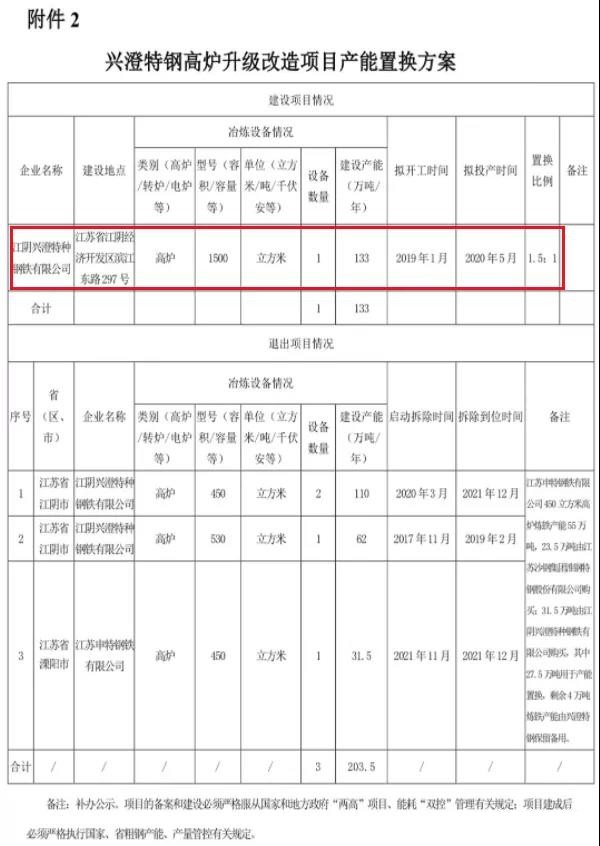 按照《國務院關于化解產(chǎn)能嚴重過剩矛盾的指導意見》、《國務院關于鋼鐵行業(yè)化解過剩產(chǎn)能實現(xiàn)脫困發(fā)展的意見》和《鋼鐵行業(yè)產(chǎn)能置換實施辦法》要求,現(xiàn)將江陰興澄特種鋼鐵有限公司(以下簡稱興澄特鋼)高爐升級改造項目產(chǎn)能置換方案予以公示,歡迎社會公眾進行監(jiān)督。公示期為2021年11月24日至2021年12月13日。如有異議,請以書面形式向江蘇省工業(yè)和信息化廳反映情況。聯(lián)系電話:025-69652731(業(yè)務咨詢)、025-69652843(信訪舉報)。