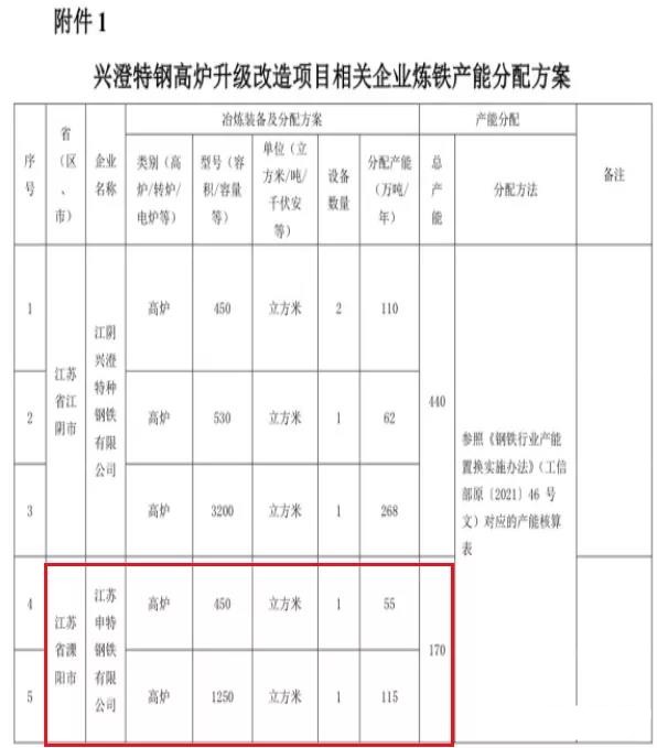 2021年11月24日,江蘇省工業(yè)和信息化廳發(fā)布《關于江陰興澄特種鋼鐵有限公司高爐升級改造項目產(chǎn)能置換方案的公示》,沙鋼集團淮鋼特鋼購買江蘇申特鋼鐵23.5萬噸煉鐵產(chǎn)能、興澄特鋼購買江蘇申特鋼鐵31.5萬噸煉鐵產(chǎn)能。