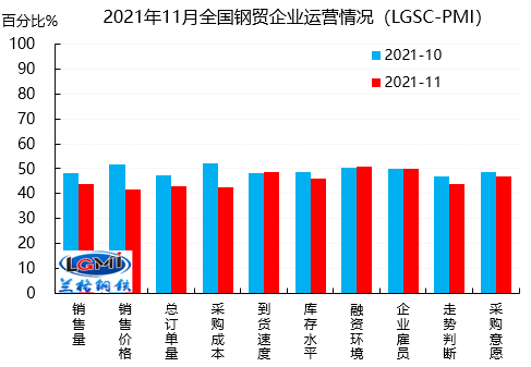11月份鋼鐵流通企業(yè)銷售量指數(shù)和訂單指數(shù)分別為43.8%和42.8%,分別較上月下降4.2和4.7個(gè)百分點(diǎn),在收縮區(qū)間內(nèi)繼續(xù)下降,國內(nèi)鋼材市場前期受到高價(jià)位鋼價(jià)的影響,市場采購需求有所不足,但鋼價(jià)大幅下挫后,下游需求開始有所放量,但整體來看,傳統(tǒng)需求淡季的影響正在逐步顯現(xiàn)。