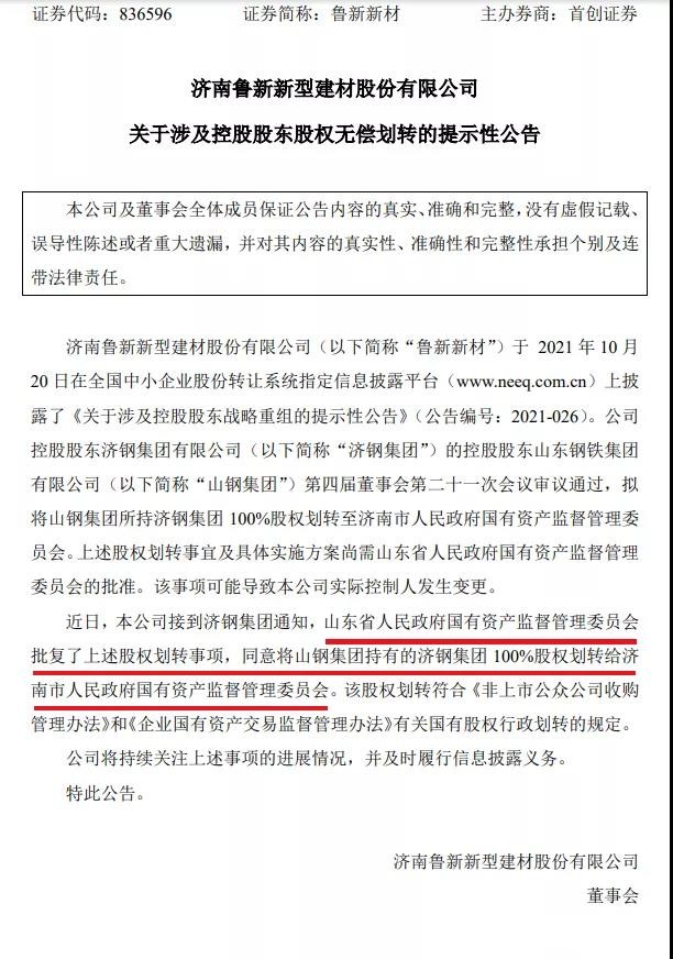 新三板掛牌公司魯新新材12月7日晚披露,近日,該公司接到控股股東濟(jì)鋼集團(tuán)通知,山東省國資委批復(fù)了濟(jì)鋼集團(tuán)股權(quán)劃轉(zhuǎn)事項,同意將山東鋼鐵集團(tuán)有限公司(簡稱“山鋼集團(tuán)”)持有的濟(jì)鋼集團(tuán)100%股權(quán)劃轉(zhuǎn)給濟(jì)南市人民政府國有資產(chǎn)監(jiān)督管理委員會。該股權(quán)劃轉(zhuǎn)符合《非上市公眾公司收購管理辦法》和《企業(yè)國有資產(chǎn)交易監(jiān)督管理辦法》有關(guān)國有股權(quán)行政劃轉(zhuǎn)的規(guī)定。