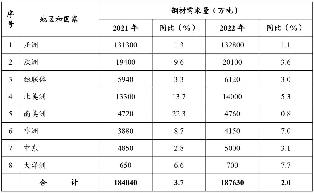2021年和2022年全球主要地區(qū)鋼材需求預(yù)測(cè)變化情況見下表。